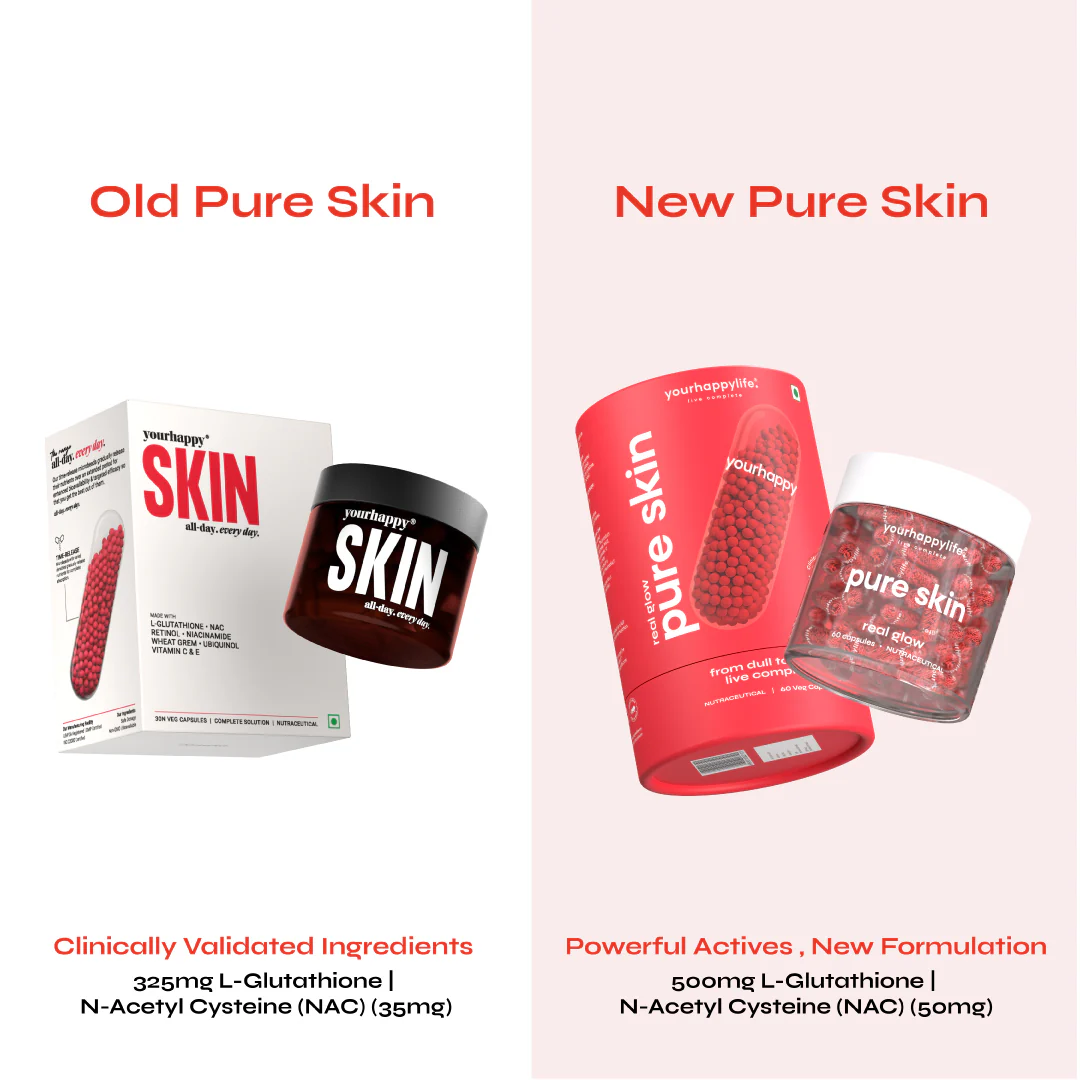YourHappy Pure Skin Capsules are a science-backed skin renewal system designed to brighten, detox, and visibly restore radiance - from the inside out. Powered by 500 mg Activated L-Glutathione (India’s highest), synergized with NAC, Vitamin C, Niacinamide, Retinol, and Evening Primrose Oil, it tackles the root causes of dullness, pigmentation, and early aging.